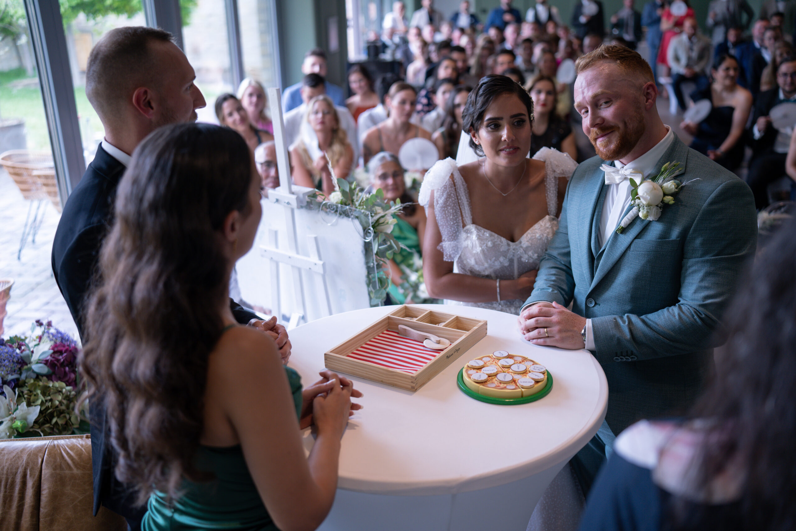 So lautete die Aussage meines Brautpaares für das Ritual ihrer Freien Trauung. Da sie beide bekannt dafür waren, beim Pizza Bringdienst zu bestellen, war für mich schnell klar : damit muss das Ritual zu tun haben. Und so wurde die Holzpizza mit mir als Freie Traurednerin und den Trauzeugen zusammen belegt, mit allen wichtigen Zutaten die man für eine Ehe benötigt. Ergänzend haben sie ihre Ehegelübte still für dich gelesen, während die Sängerin ein Lied zum Besten gebracht hat.