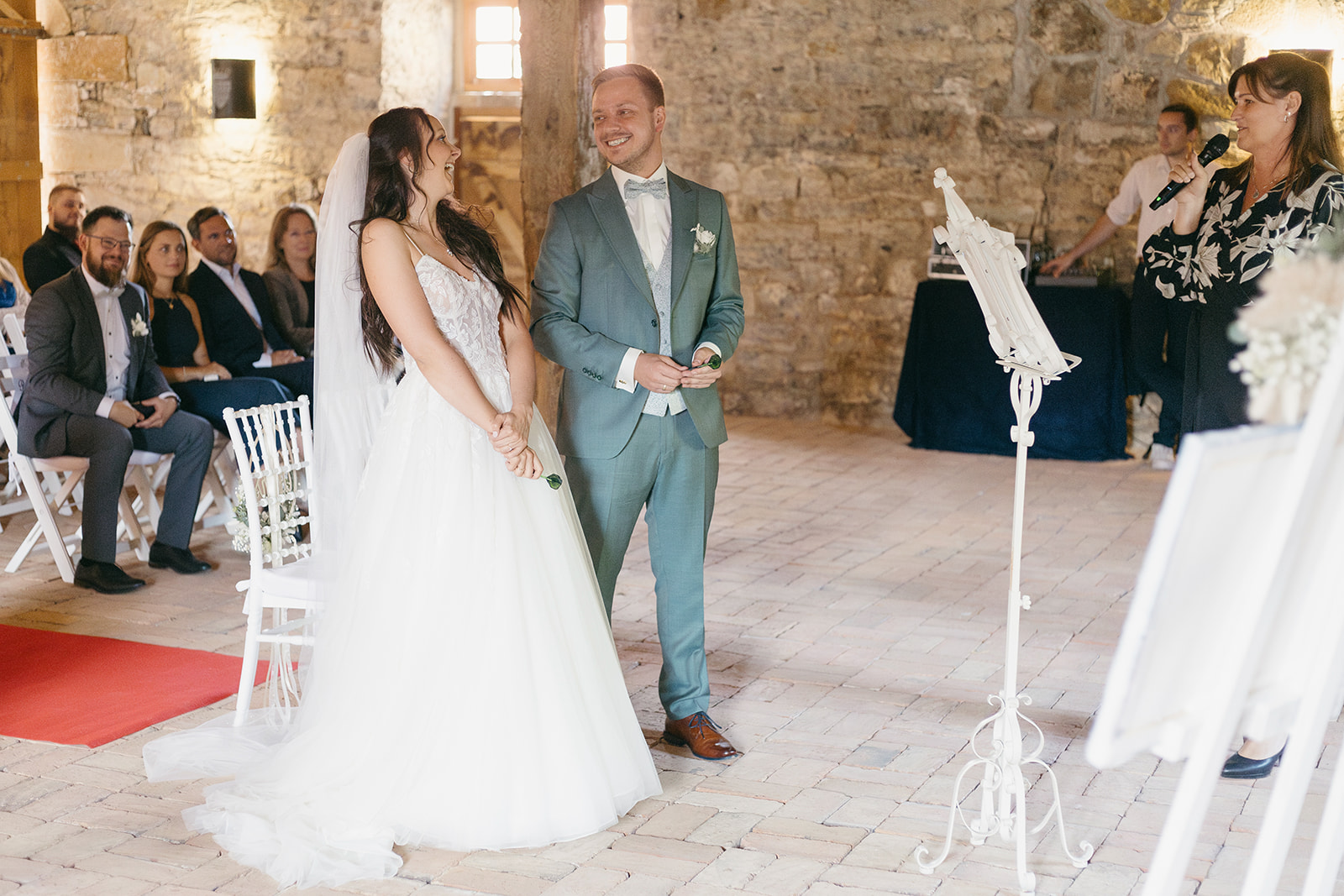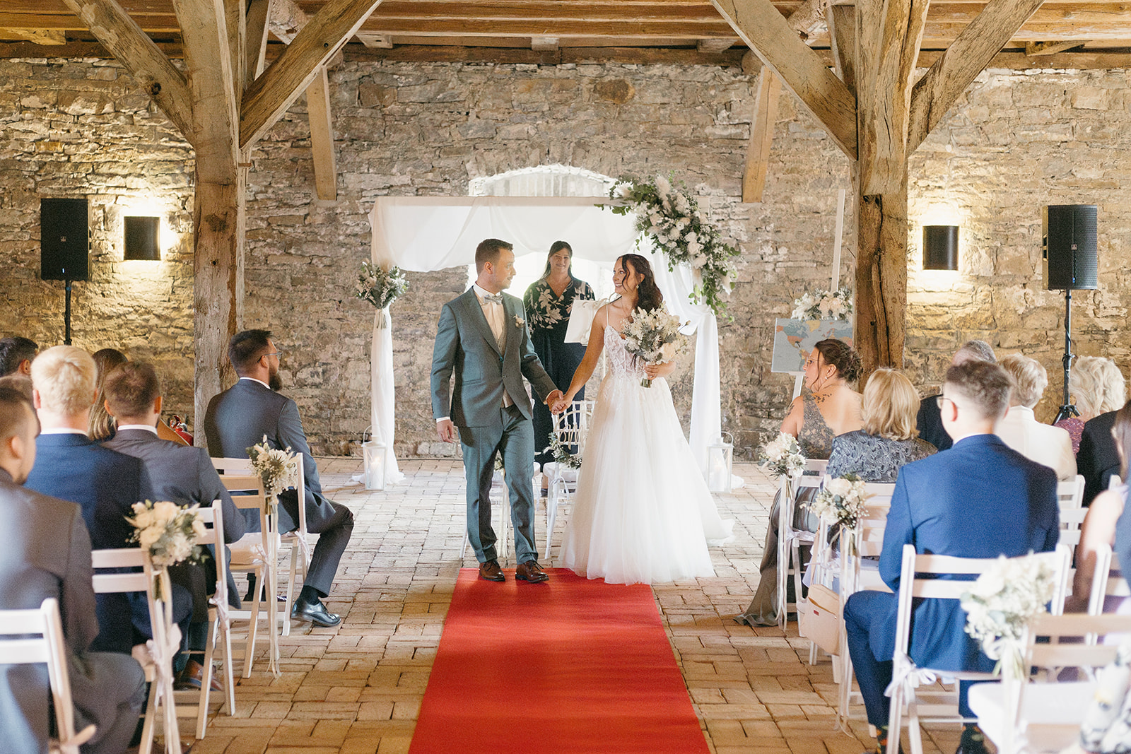 Ich arbeite das Ritual als Freie Traurednerin mit meinen Brautpaaren gemeinsam im Detailgespräch aus, während sie mir ihre Geschichte für die Trauzeremonie erzählen. Durch Hobbys und besondere Momente, entsteht so oft die zündende Idee, die authentisch und persönlich genau auf sie zugeschnitten passt. Bei meinen Beiden hier, war der Dartverein und das Reisen sehr präsent und so haben wir in der Freien Trauung das nächste Reiseziel mit Dartpfeilen auf einer Weltkarte erworfen und alle Gäste waren an der Hochzeit live dabei. Zusätzlich hatten sie noch richtig coole Flowerboys als Special beim Auszug der Trauung.
