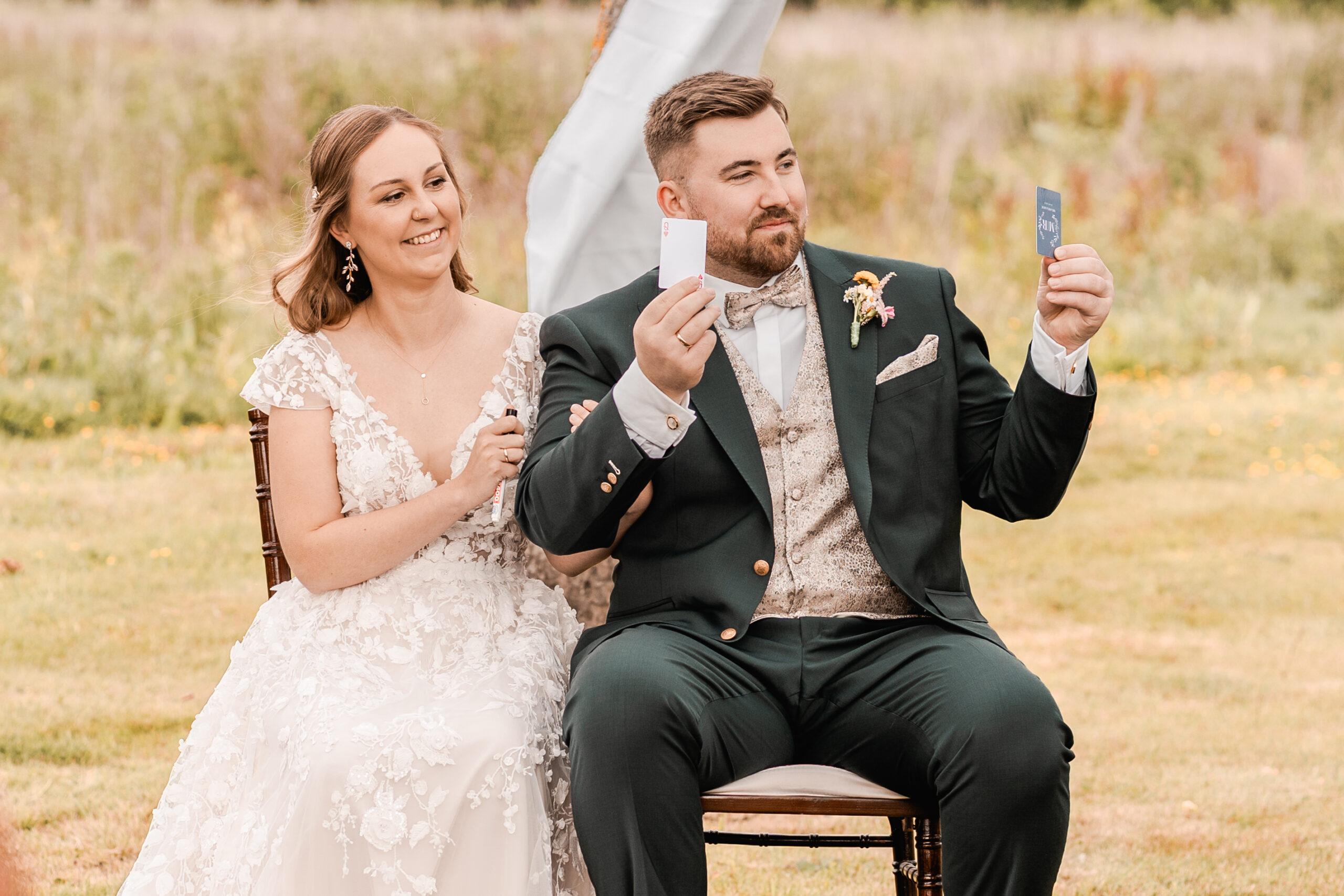 Mein Brautpaar bei dieser Freien Trauung, liebte die Spieleabende mit Freunden und Familie. So wurde dieses authentische Ritual für ihre Trauzeremonie und gleichzeitig Gästebuch für ihren Hochzeitstag ins Leben gerufen. Alle Gäste der Hochzeit, bekamen wärehnd der Trauung eine personalisiert Karte mit dem Hochzeitslogo und durften sie mit lieben Wünschen beschriften. Ergänzend haben die Trauzeugen eine emotionale Rede vorgetragen.
