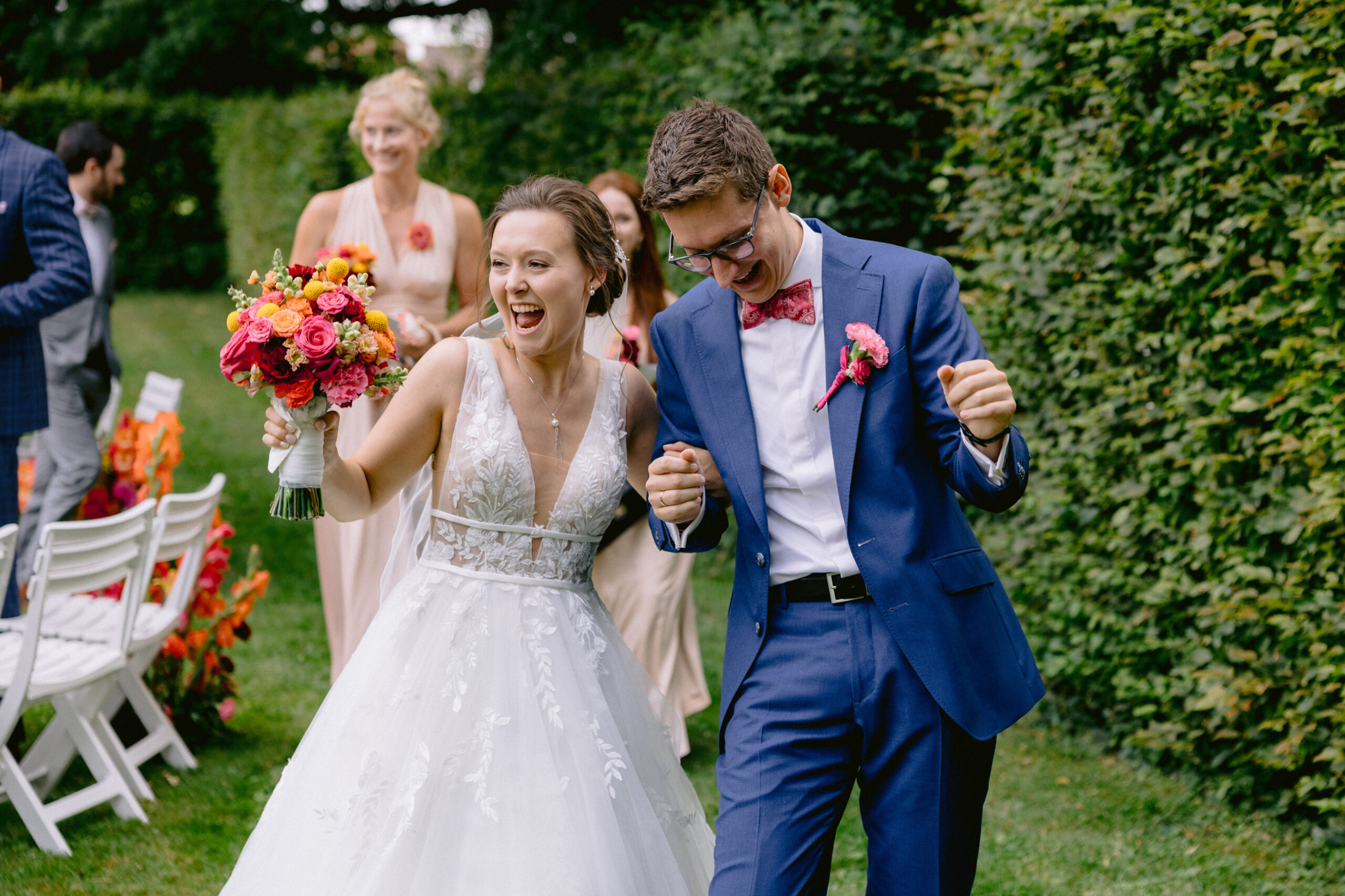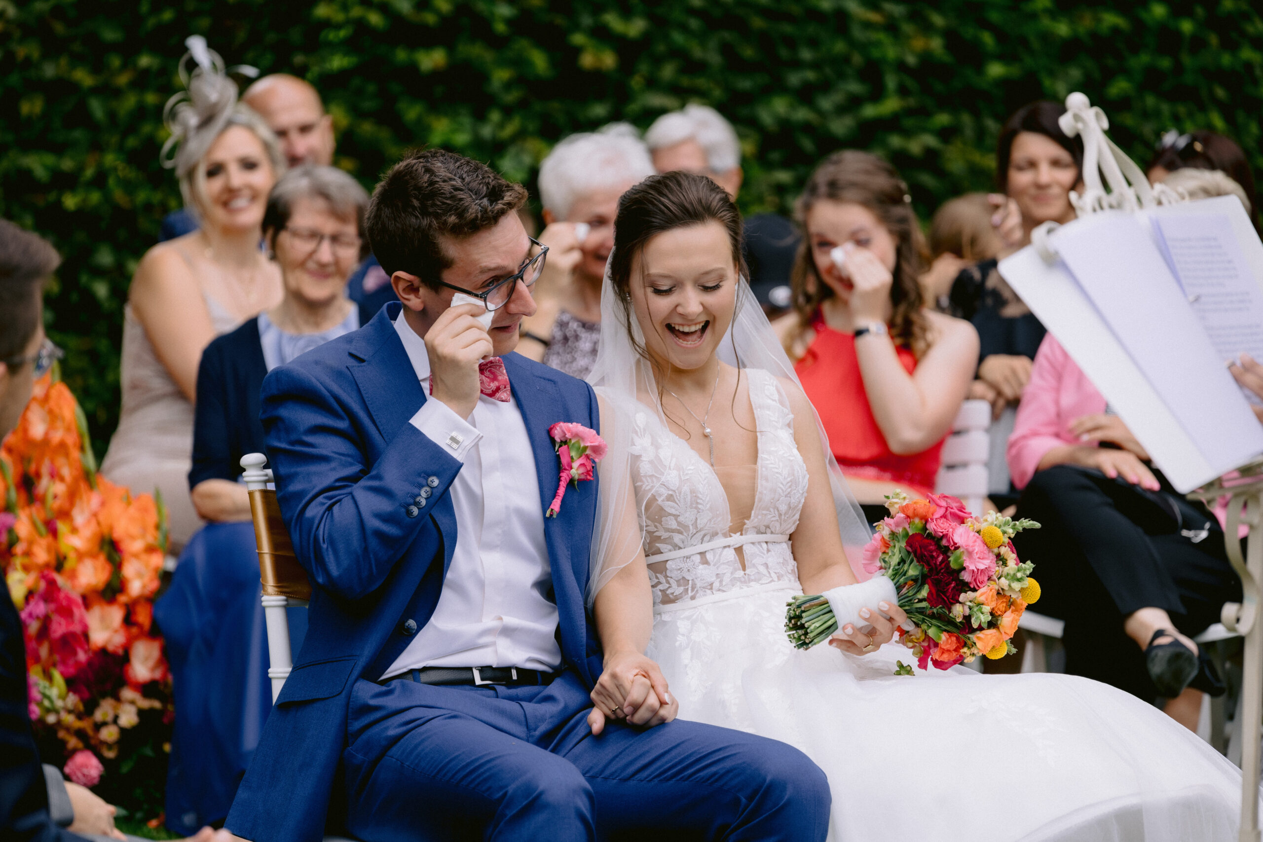 Bei dieser Freien Trauung, sprudelte die Lebensfreude und Emotionen nur so über. So eine positive und durchweg lachende Hochzeitsgesellschaft, habe ich selten erlebt. Von den Farben der Deko, über die Stimmung bei der Freien Trauung und den Emotionen beim Riutal, als die Ringe durch die Reihen gingen um mit guten Wünschen der Gäste versehen zu werden, war es eine Freude dieses miterleben zu dürfen.Ergänzend haben die Trauzeugen eine wunderbar passende Rede für ihr Brautpaar am Hochzeitstag vorgetragen.
